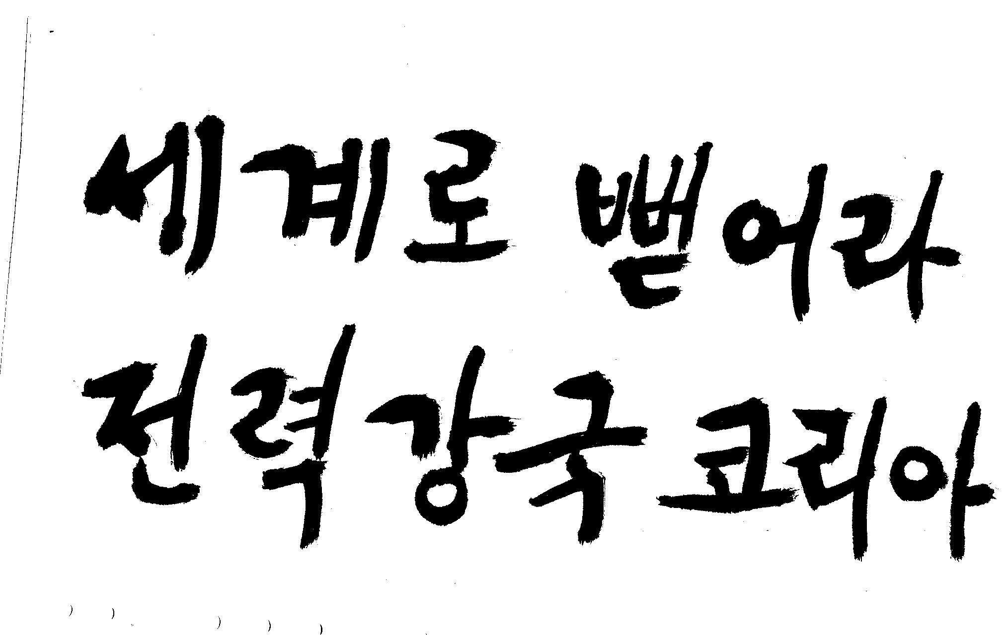 캘리 좀 부탁드려요!~ 김철호 일반 1 12172 2008.12.24 12:08 > > 전력회사 신문광고를 하는데요 캘리로 멋지게 하고픈데 > 캘리프로그램으로 아무리 써도 느낌이 안나옵니다 ㅜ.ㅜ > 이런걸 부탁한다는 자체가 너무나도 염치없지만 부탁드립니다. > > 세계로 뻗어라! 전력강국 코리아 > 보기는 쉬워도 하기는 어려운게 세상 모든 일 일겁니다. 그중에 캘리그라피가 그런것 일 겁니다... 스캔중에 글꼴이 잘린것은 서로다른글꼴서 편집하시길... 글수가 많아서 어쩔 수없네요...